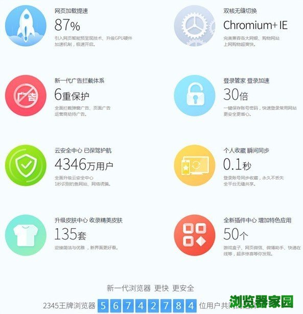全球浏览器网网站提供电脑版2345王牌浏览器下载最新官方版安装。2345王牌浏览器(现已改名2345加速浏览器)是一款基于Chrome和IE双内核的浏览器,主打极速与安全特性。2345王牌浏览器目前实现的功能主要是智能广告拦截、网页多标签浏览、超级拖拽、鼠标手势、上网痕迹清除、老板键等多项网页浏览实用功能。新一代王牌浏览器,更新更安全。2345王牌浏览器(2345Explorer)作为2345网址导航首要入口诞生于2010年12月,是上海二三四五网络科技有限公司主推的重要产品之一。2014年6月上海二三四五网络科技股份有限公司(简称“2345”)对外宣布,旗下产品2345智能浏览器发布新版本并正式更名为“2345王牌浏览器”。2016年7月为了表明2345浏览器助力用户提速的决心,随着最新版本的发布,2345王牌浏览器又最终更名为2345加速浏览器。