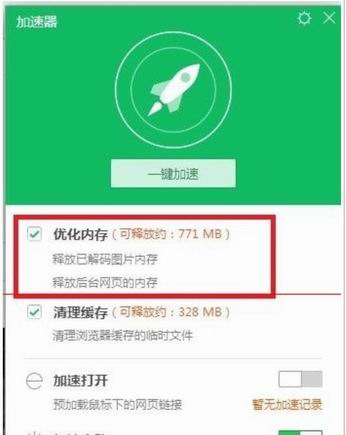 5、进入加速器后你会发现,【优化内存】的可释放很大,一般大于1G就有可能出现上面的现象。