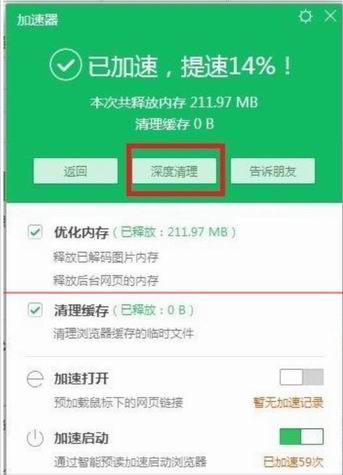 7、重新启动一下浏览器,就行了。如果还不行,【一键加速】后,选择【深度清理】