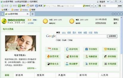 360浏览器老年版怎么样?360浏览器老年人专版好用吗?360浏览器老年人专版是360全新推出的老年人专用浏览器。产品考虑到老年人的需求,在浏览器界面外观、网址导航、功能应用上做出了针对性调整,以适应老年人的使用习惯、视觉和健康需求。还没有给妈妈买节日礼物的同学,表达一下心意吧!给妈妈的电脑安装360浏览器老年专版,它独有的:简洁大按钮、大比例浏览网页、柔和淡绿背景、健康温馨提醒、全都适合老年人的习惯。