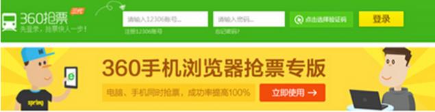 从360一系列针对手机浏览器产品的推广节奏来看,今年360手机浏览器抢票专版将是一款抢票利器,360浏览器技术人员建议旅客用360手机 浏览器和360安全浏览器(PC端)同时抢票,手机端的加入会增加抢票成功概率,360今年优化了移动端抢票功能,全新上线了自动识别图片验证码功能,用 户无需填写图片验证码即可成功购票,提高了购票速度与概率,此外,360为手机端抢票功能新增了上百台服务器,在技术和设备上均加大了空前投入力度,手机 抢票成功率将会更高。
