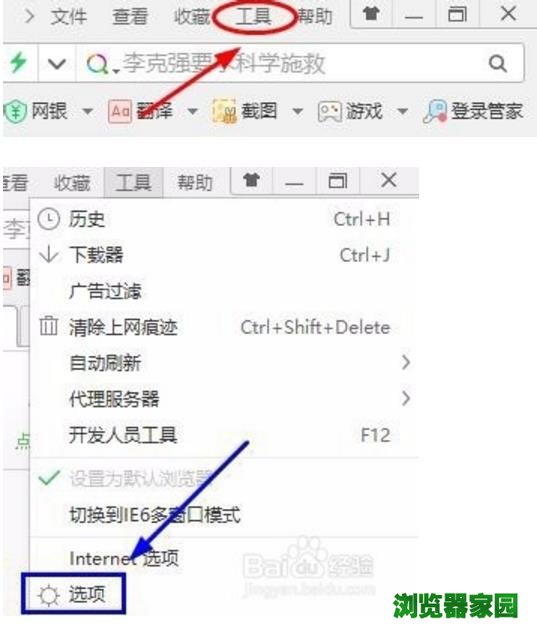 1、一旦出现主页被篡改,那么首先我们要在浏览器右上角找到"工具"选项,如图;点击之后在弹出的下拉菜单里我们选择"选项";