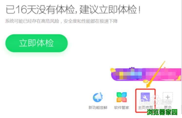 6、以上方法适用于普通的主页修改,如果遇上比较顽固的情况可能效果就不太好了,此时我们打开360安全卫士,在右下角可以看到一项"主页修复",如下图所示;