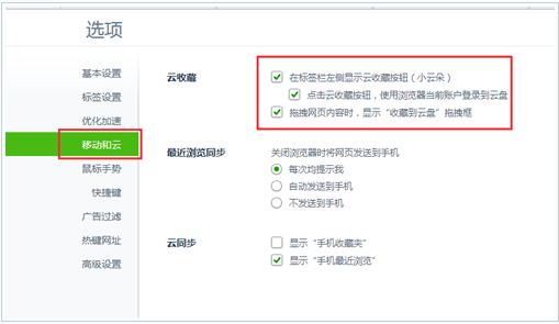 2、然后找到移动和云把那个拖拽网页内容时,显示云收藏。把钩钩给去除掉。如图所示: