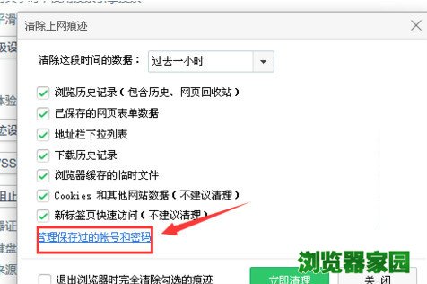 3.在清理上网痕迹小窗口中可以看到蓝色字“管理保存过的账号密码”,并点击打开,进入密码管理
