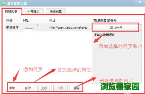 网页列表:是保存了其网页登陆的密码列表。我们可以选择某一个网页进行账户密码修改、删除和添加账号这些功能。还可以在这里添加某一个网页及这个网页的账号密码