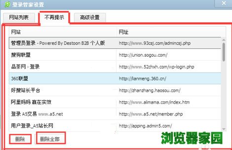 不再提示:是登陆过账户密码但是选择不保存密码和不再提示是否保存密码的网页。如果我们想让某一个网页在下次登录的时候提示我们是否保存账户密码则选择这个网页点击下面的删除即可。也可以把所以的网页删除掉