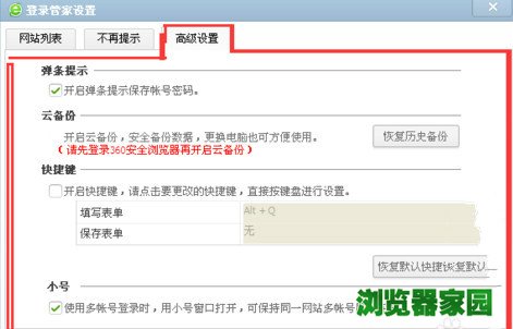 高级设置:勾选开启弹条提示保存账户密码,备份账号密码到云备份,还有设置快捷键等设置。同时还可以使用多账号登录时,可保持同一网站多账号同时在线等高级功能