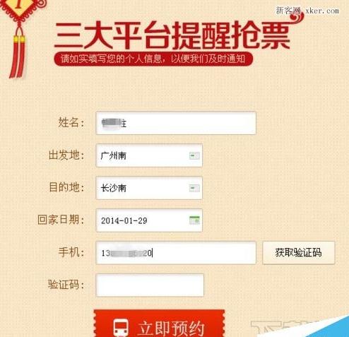 找到填写预约信息的地方,填上你的姓名,出发地,目的地,回家日期,手机号码,点获取验证码,如果收不到验证码,可以多试几次。如下图