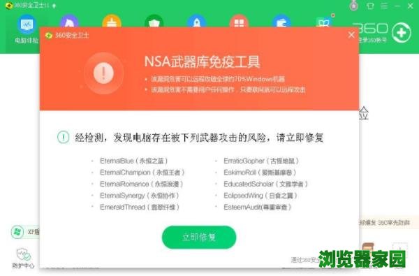 四、360安全卫士【离线救灾版】的NSA武器库免疫工具会自动运行,并检测您的电脑是否存在漏洞。