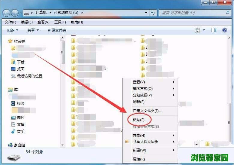 打开U盘,在窗口的空白区域右击,选择粘贴选项。