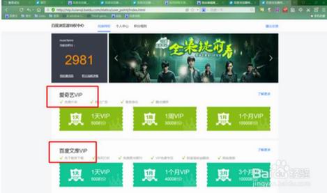 1、在特权中心界面,我们可以看到总共有两个类型的vip,一个是百度文库,一个是爱奇艺,反正都是用积分兑换的。