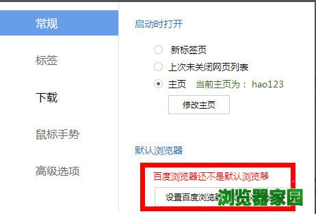2、在常规的一栏看到主页是360首页“百度浏览器还不是默认浏览器”,下一行是“设置百度浏览器为默认浏览器”。我们点击一下“设置百度浏览器为默认浏览器”。