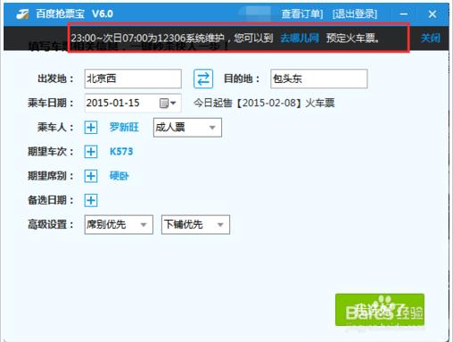 23:00~7:00为12306系统维护时段,无法通过12306订票,百度抢票宝通过与去哪儿合作,独家提供夜间时段订票功能,24小时订票无忧!