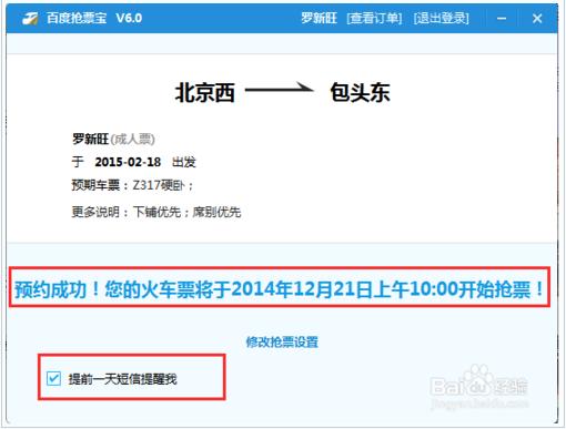 选择不在预售期的日期订票,自动进入预约流程,我们将在抢票前一天通过短信提醒你,当天通过百度卫士提醒你抢票。