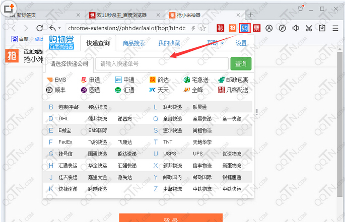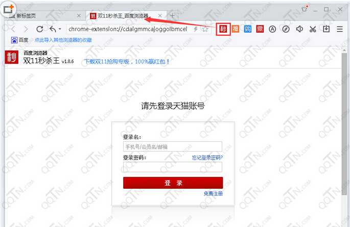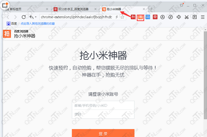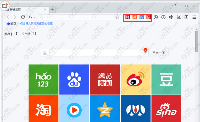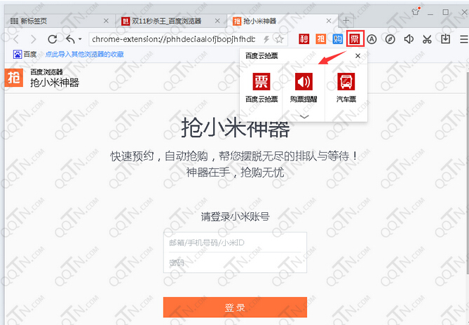 安装百度浏览器疯抢版后,打开后在工具栏上会集成秒、抢、购、票四个抢购工具