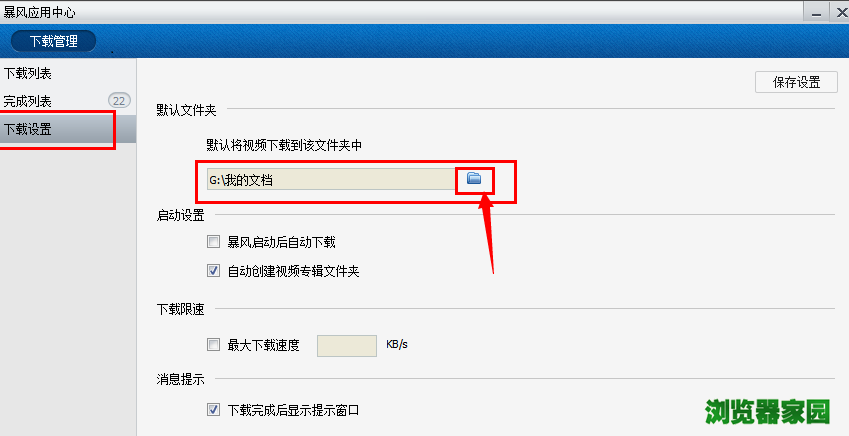 点击暴风影音界面左下角的工具箱,选择下载管理,点击下载设置,然后点击文件夹图标,进入文件夹中选择相应的文件夹。