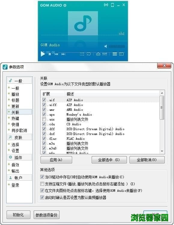 GOM Audio Player 内置三种显示形式的默认皮肤,用户可以自由选择。用户也可以在参数选项中的皮肤标签中选择更多的皮肤。