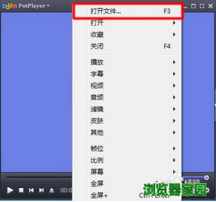 1、打开daum potplay视频播放器,先打开一个视频。右键单击播放器屏幕->"打开文件"。这个视频播放器支持的格式还不少。