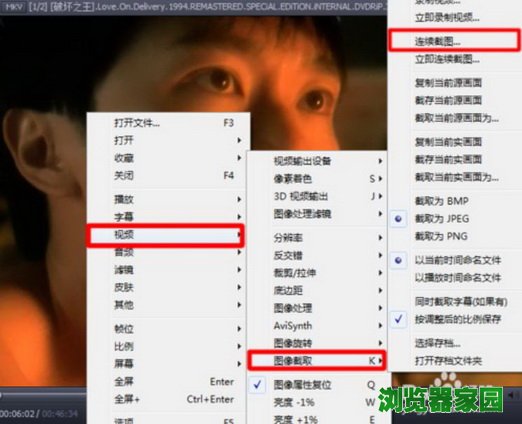 2、打开视频后,再右键单击播放器屏幕->"视频"->"图像截取"->"连续截图"。或者直接按快捷键“ctrl+G”也行。