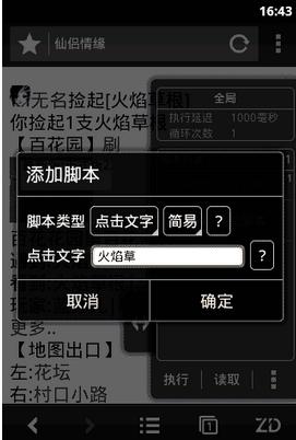 点击脚本列表中的添加脚本,在弹出脚本对话框里选择点击文字-简易,在“点击文字”对话框输入“火焰草”,也就是我们要刷的怪物,然后点击对话框的确定按钮。