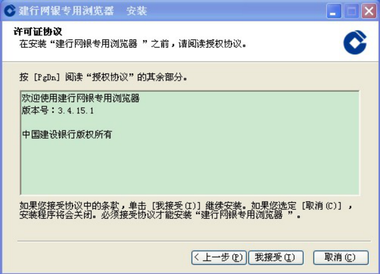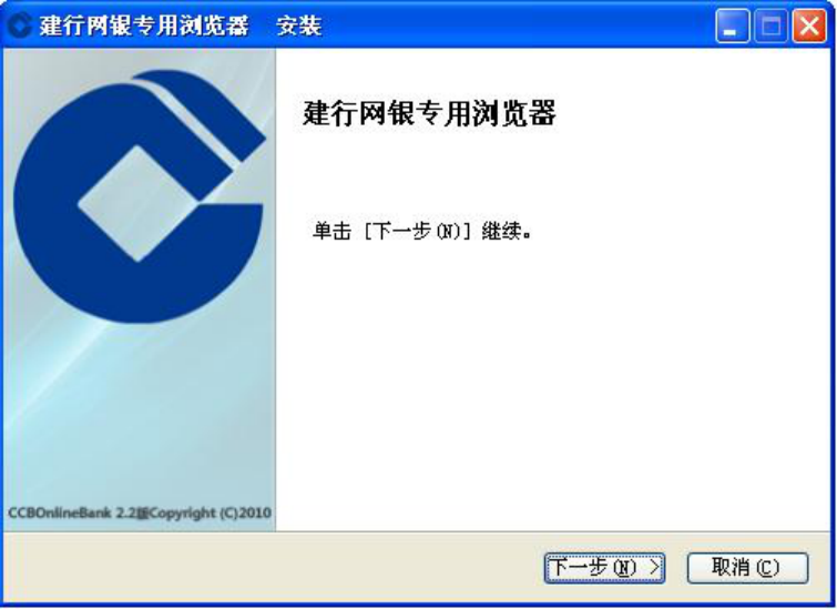 (1)客户双击下载至本地电脑的建行网银专用浏览器安装程序图标,进入安装界面,点击下一步。如图: