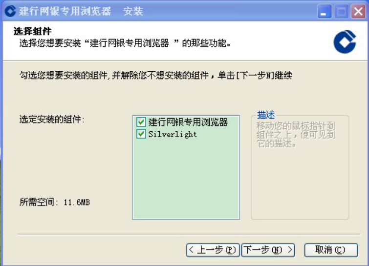 (3)选择安装组件。组件包括:建行网银专用浏览器和Silverlight。