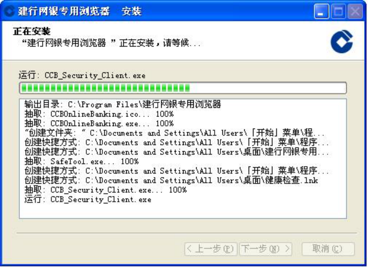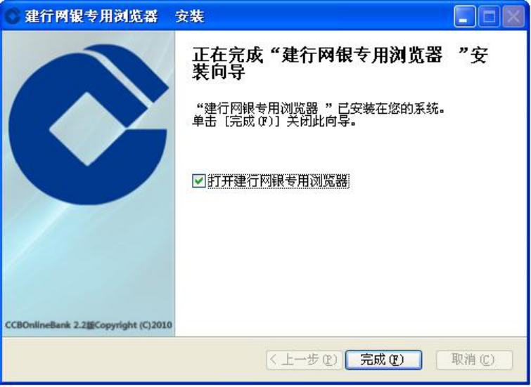 (8)安装界面提示客户建行网银专用浏览器安装成功,客户点击“完成”。如图: