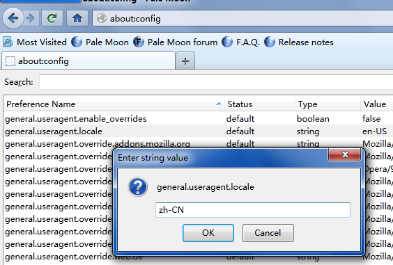 2、在地址栏输入about:config,找到general.useragent.locale双击,将默认值改为zh-CN,最后重启浏览器即可。