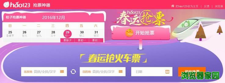 全球浏览器网网站提供hao123浏览器抢票专版下载V1.1.9.1官方版免费下载安装。hao123浏览器春运专版是一款抢火车票专版浏览器软件,欢迎使用hao123抢火车票神器购买2017春运回家的火车票。这是百度浏览器为hao123定制的春运专版抢票浏览器。