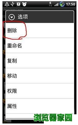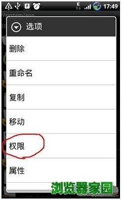 7、要删除哪个文件,就在该文件上长按,会出现“选项”,选择“权限”: