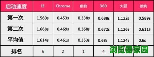 测试结果显示猎豹启动性能出众,平均启动耗时0.353秒,领先于其他五款浏览器。Chrome表现也不错,与猎豹差距不大。国产浏览器也就搜狗表现尚可。