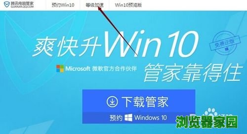 3、进入QQ电脑管家Windows10升级助手页面,我们点击导航上面的等级加速,