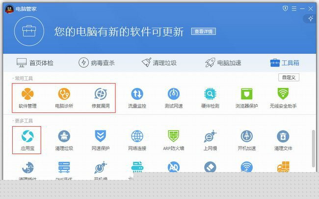 答:电脑管家8版本中的【软件管理】、【电脑诊所】、【修复漏洞】、【应用宝】在2019最新版版本中都搬到了工具箱中,以APP的形式呈现。