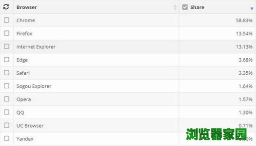 稳坐第一宝座的还是Chrome,虽然略有下降,但还是保持在了58.83%的水平。需要注意的是,这只是Chrome浏览器占有率,而非其他采用Chromium内核的第三方浏览器,像QQ浏览器和搜狗浏览器这种双核浏览器也就1%多的市场占有率,诸如360和百度浏览器占有率极低的浏览器就是另一个故事了。最惨的还是Edge浏览器,只剩3.68%的用户在使用这款看起来花了微软很多心思的作品。