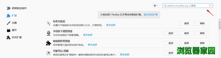 之前版本附加组件页面右上角的搜索框可以搜索本地扩展和 AMO 中的附加组件,在 59 版本搜索框提示文字改为 “在 http://addons.mozilla.org 上搜索”,也就是说输入关键词将不再显示本地扩展,而是在新标签页打开 AMO 进行搜索。因为 AMO 的扩展页面并不会显示这个扩展是否已经安装,对于安装了较多扩展的用户,想寻找某个扩展会变为一件痛苦的事情。