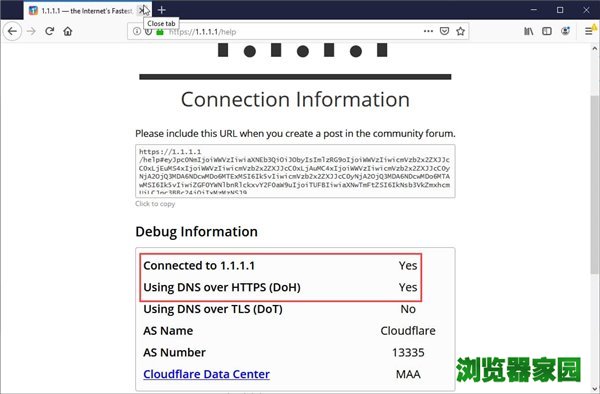 如果“Connected to 1.1.1.1”和“DNS on HTTPS(DoH)”的状态都是“Yes”,则Firefox正在使用Cloudflare DNS