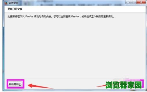 然后提示更新已可安装,可以点击重启Firefox,或者继续工作然后再点击稍后重启,此处全球浏览器网小编建议点击右下角的“重启Firefox”。