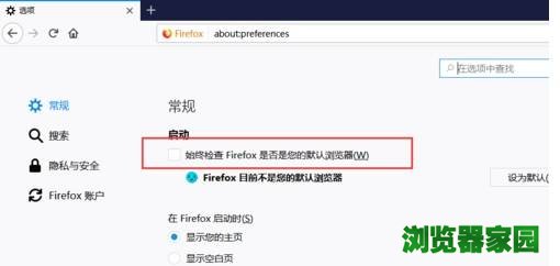 2. 在网址输入栏中输入: about:preferences,后按下回车键,在弹出的界面中勾选【始终检查Firefox是否是您的默认浏览器】