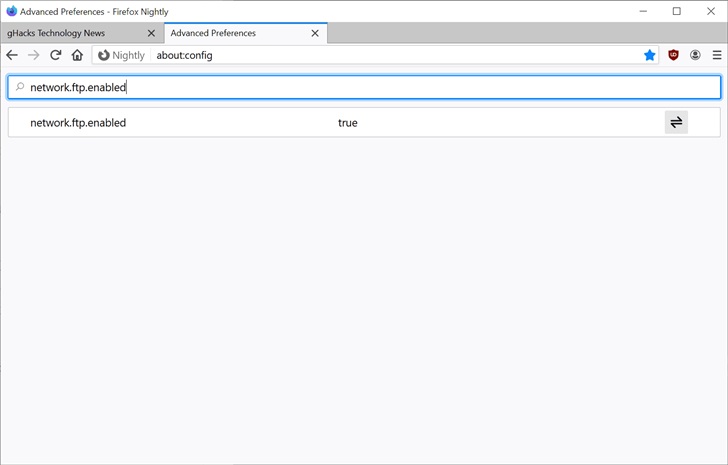 搜索 network.ftp.enabled:将首选项设置为 TRUE 以在 Firefox 中启用 FTP 支持;将首选项设置为 FALSE 可禁用 Firefox 中的 FTP 支持。