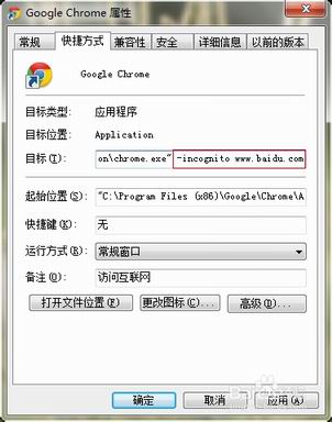 2、将“ -incognito”添加到目标后面(命了前方一定要有空格)然后点击确定