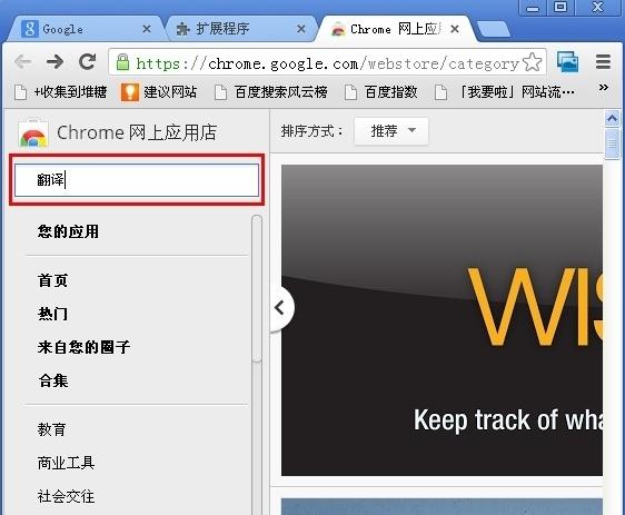 第四步:进入谷歌网上应用店后,在搜索栏里输入“翻译”,按回车键。
