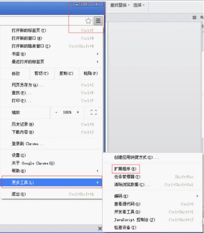 接着点击浏览器右边的有三横的图标,选择更多工具--扩展程序,如图: