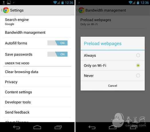 据说Chrome提供了带宽管理功能,不过我在设置中只找到了一个相关的选项:网页预加载。和桌面版的兄弟一样,Chrome for Android支持网页预加载,这可以让网页打开速度更快。当然出于对移动版的考虑,在默认情况下预加载功能仅在连接WiFi时开启。