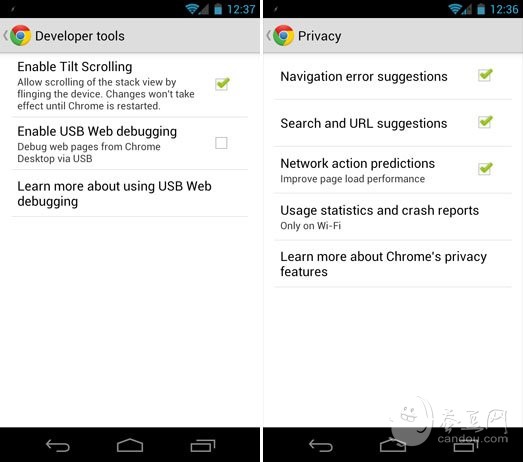 对于开发者来说Chrome for Android也提供了一些开发者工具,但目前开放的还只是一部分。除了刚才提到的带宽管理之外还有通过USB来调试网页等等。而一些普通的设置选项包括:自动填写表格、保存密码、隐私设置等等。