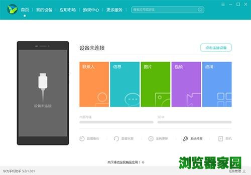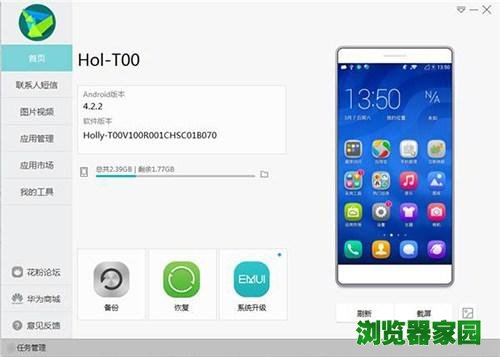 2.通过USB数据线将手机连接至电脑。在电脑上,华为手机助手将自动开启。