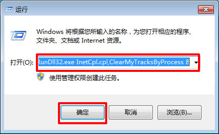 2.在运行的文本输入框中输入“RunDll32.exe InetCpl.cpl,ClearMyTracksByProcess 8”(不含引号)。点击“确定”。