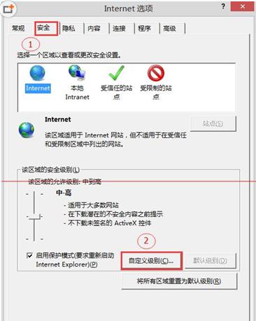 2、进入“安全”标签,点击“自定义级别”,然后在弹出的“安全设置”中找到“将文件上载到服务时包含本地目录路径”项,启用;