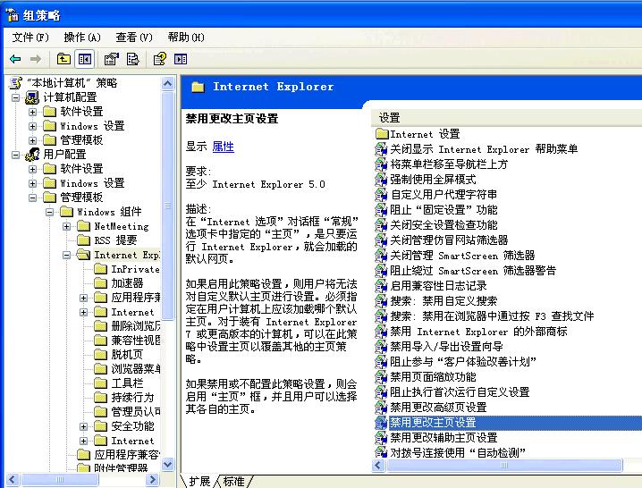 功能键+w或者是在“开始”菜单里面找到“运行”键入gpedit.msc打开本地组策略编辑器,按照路径依次打开选用户配置/管理模板/Windows组件/Internet Explorer,找到“禁用更改主页设置”,双击打开勾选已启用,然后下面输入你想要设置的主页,确定退出。使用此方法能很大的程度上防止主页被篡改。