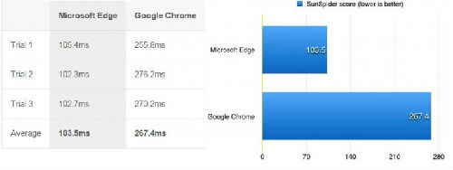 可以看出,Edge毫无争议地击败了Chrome。SunSpider给Edge的评价是:“能够帮助开发者应对真正的性能问题。”这一句Edge得一分。